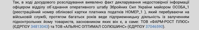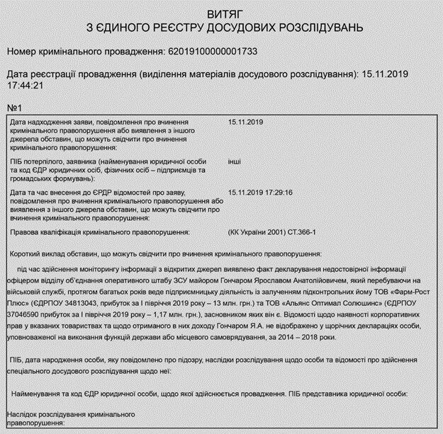У витязі з ЄРДР по кримінальному провадженні №62019100000001733 йдеться: “Під час здійснення моніторингу інформації з відкритих джерел виявлено факт декларування недостовірної інформації офіцером відділу об'єднання оперативного штабу ЗСУ майором Гончаром Ярославом Анатолійовичем, який перебуваючи на військовій службі, протягом багатьох років веде підприємницьку діяльність із залученням підконтрольних йому ТОВ «Фарм-Рост Плюс» (ЄДРПОУ 34813043, прибуток за І півріччя 2019 року – 13 млн. грн.) та ТОВ «Альянс Оптимал Солюшинс» (ЄДРПОУ 37046590 прибуток за І півріччя 2019 року – 1,17 млн. грн.), засновником яких він є. Відомості щодо наявності корпоративних прав у вказаних товариствах та щодо отриманого в них доходу Гончаром Я. А. не відображено у щорічних деклараціях...”.